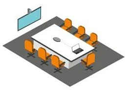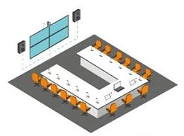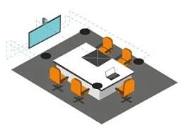 - Малая переговорная комната. Компактное оснащение для переговоров на 4–8 человек: панель или дисплей, потолочный микрофон, камера с широким углом обзора и система управления одним касанием.