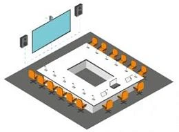 - Большой конференц-зал. Профессиональное оснащение для совещаний, презентаций и онлайн-конференций с большой аудиторией: PTZ-камеры, микрофонные системы, видеостены или проекционное оборудование.